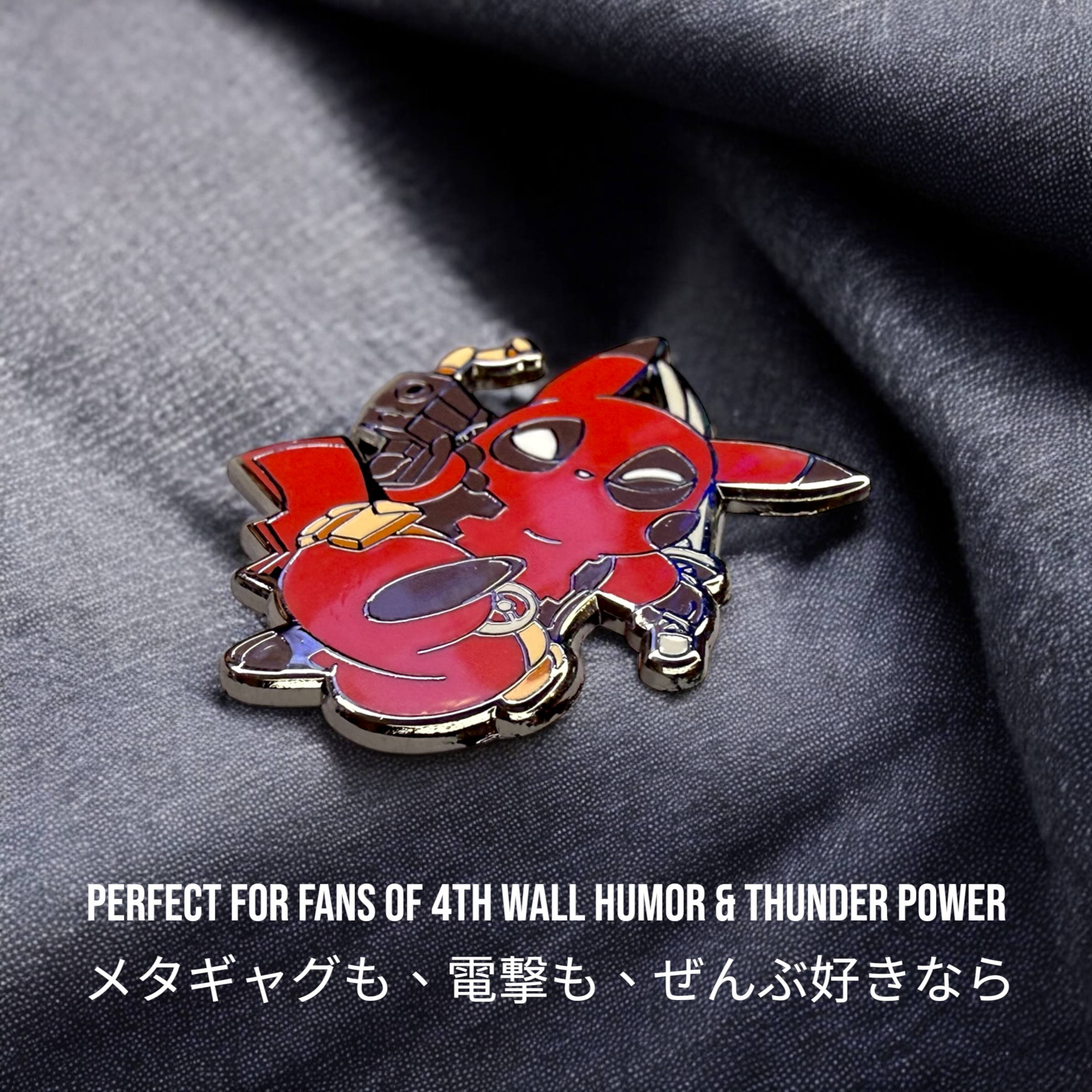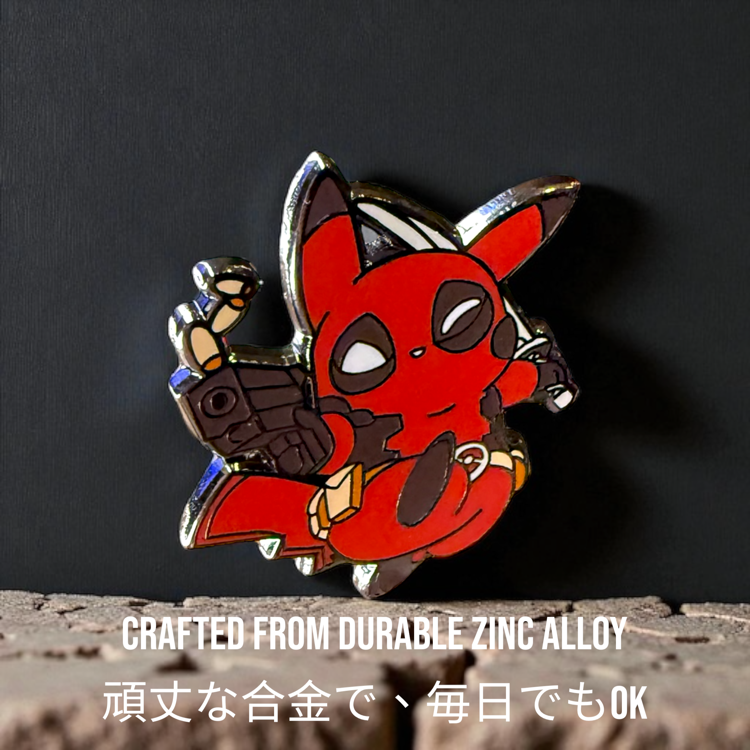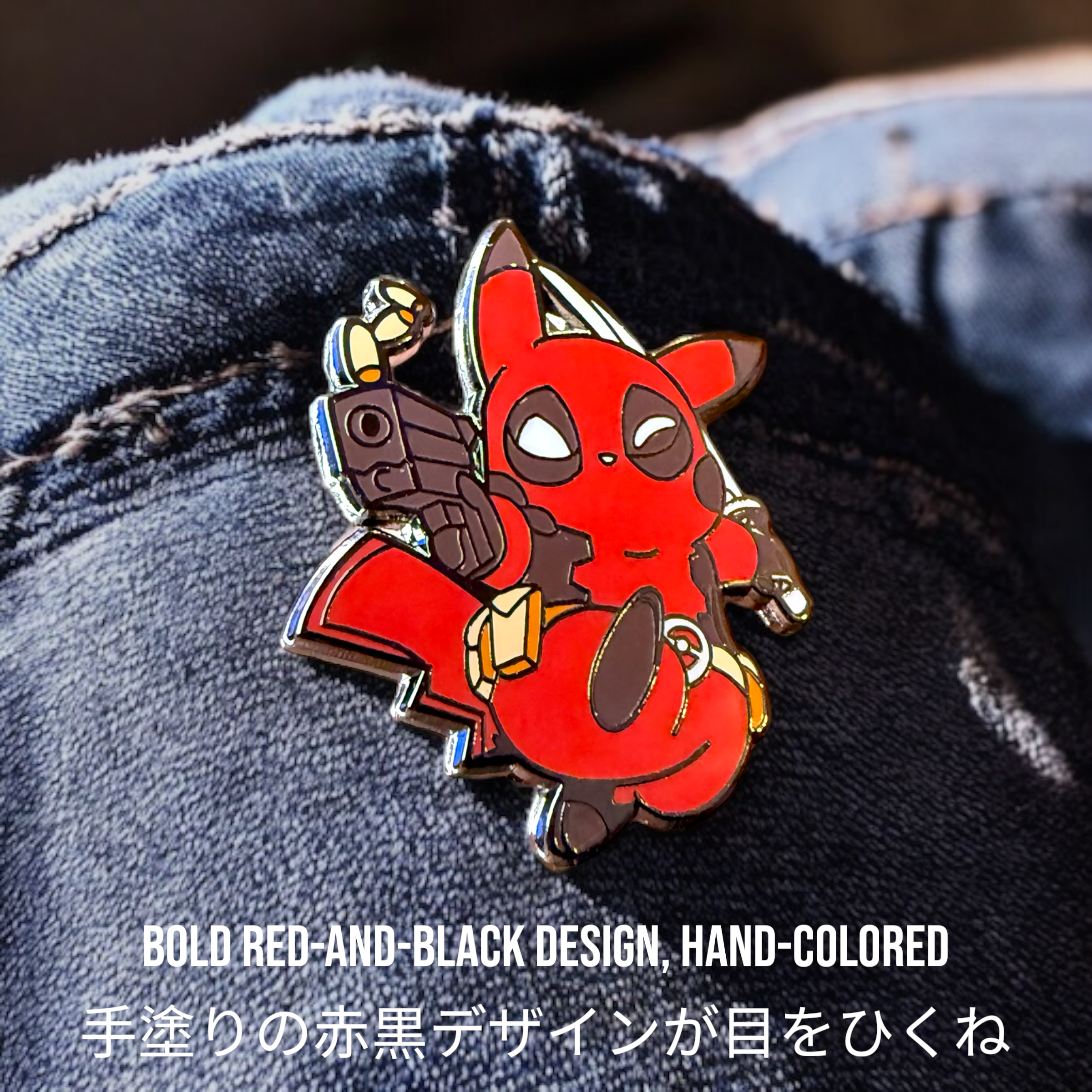 This Pokemon Deadpool pin enamel features Pikachu in Deadpool’s signature red-and-black suit, blending the world of electrifying battles with sharp-witted mercenary charm. Hand-colored on durable zinc alloy, this bold mashup captures the essence of both universes in a vibrant anime pin style. From the chubby cheeks and lightning tail to the twin katanas and fourth-wall smirk, every detail makes it a conversation starter. Whether displayed with your Pikachu pins collection or given as a pokemon deadpool gift, it’s a must-have anime pin collectible for fans of crossover creativity.