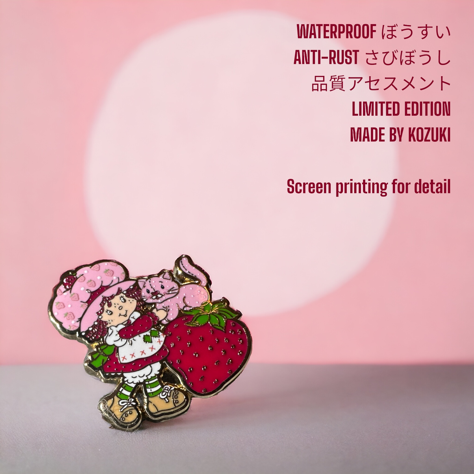 This Strawberry Shortcake pin enamel captures the sweet charm of Strawberry Shortcake with her signature pink hat, cuddling her cat next to a giant strawberry. A delightful choice for collectors of Strawberry Shortcake pins, anime pin lovers, and anyone seeking a cute Strawberry Shortcake gift.
