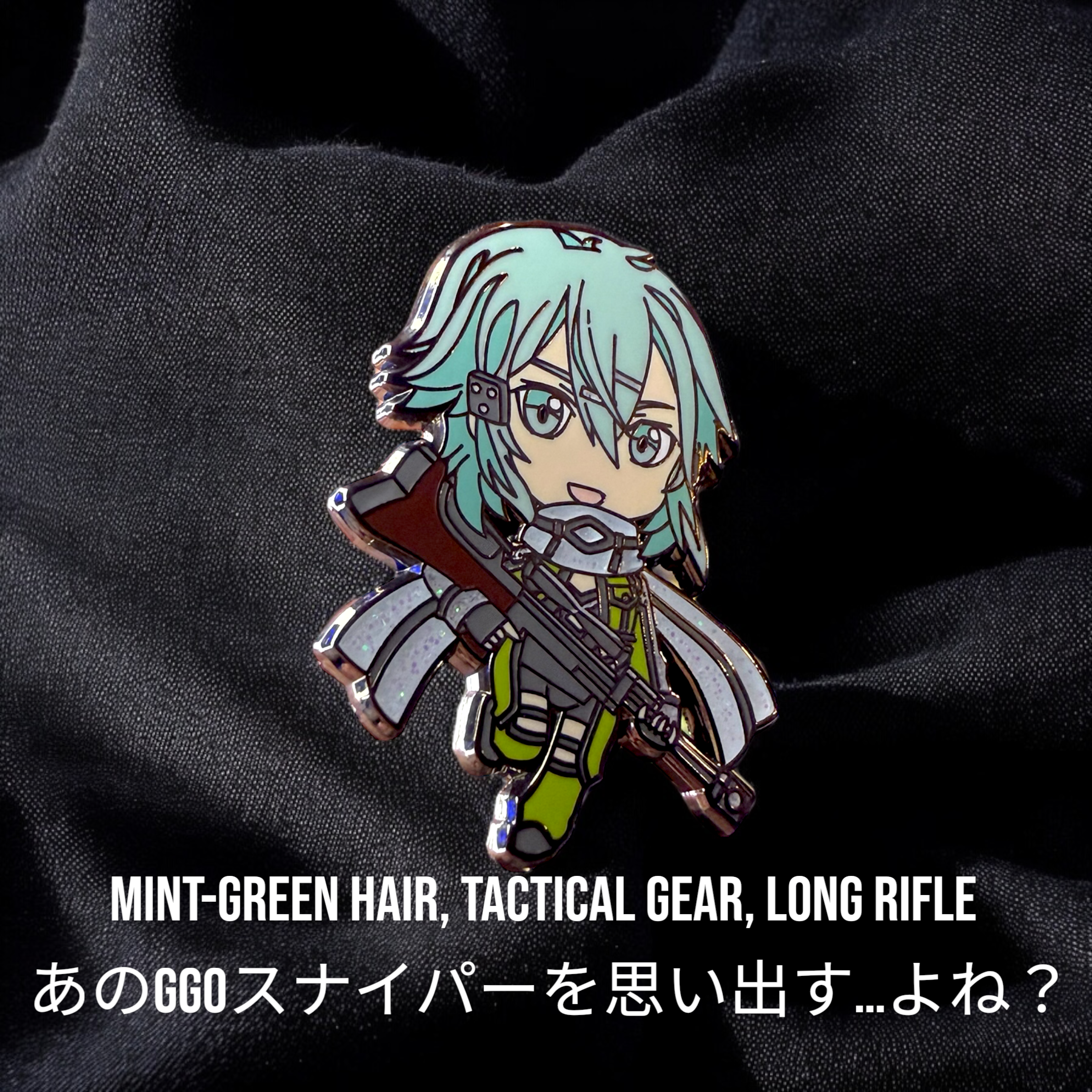 This Sword Art Online pin enamel showcases Sinon in her GGO sniper gear with mint-green hair, crafted from glossy hard enamel and durable zinc alloy. Ideal for Sinon pins collectors, it’s a Sword Art Online gift that doubles as a standout anime pin collectible.